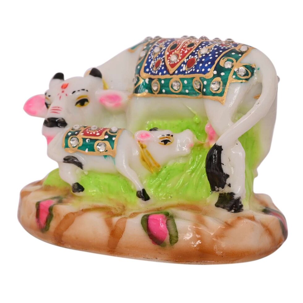 This beautiful white marble statue depicts a Kamdhenu cow and her calf. The Kamdhenu is a sacred cow in Hinduism, believed to be the source of all desires and capable of granting wishes. This statue is hand-carved from marble and would be a perfect addition to your home or office, or as a gift for someone special.