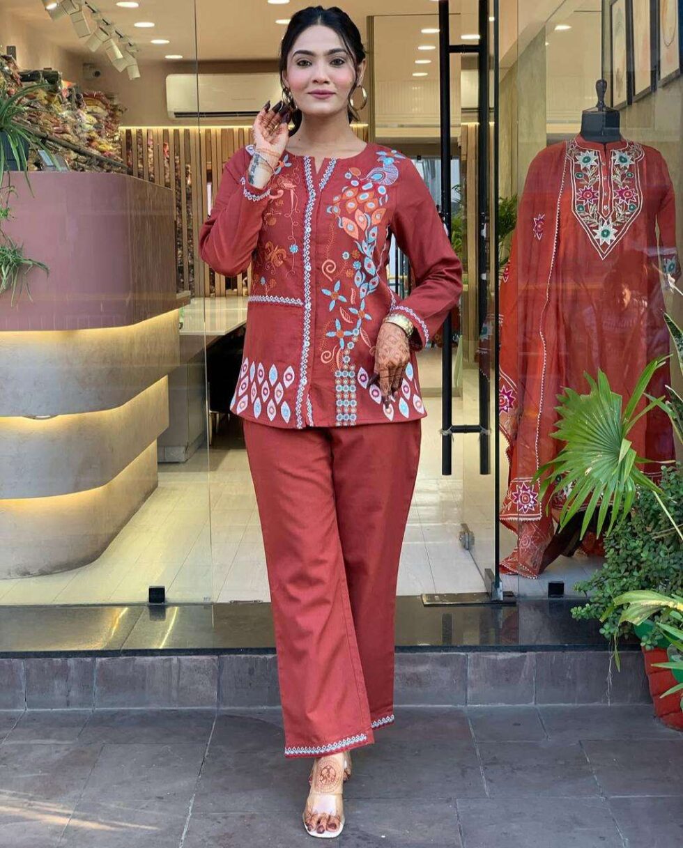 Women’s Cotton Embroidery Straight Kurti With Pant Set