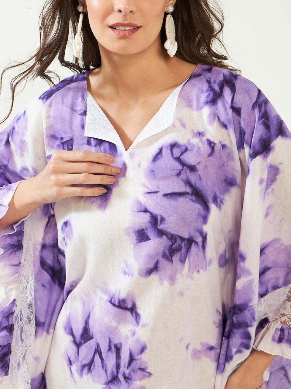 Women’s Cotton Tie Dye Print Knee Length Kaftan Drees Beach Cover Up, Spring Casual Wear ( Purple White )