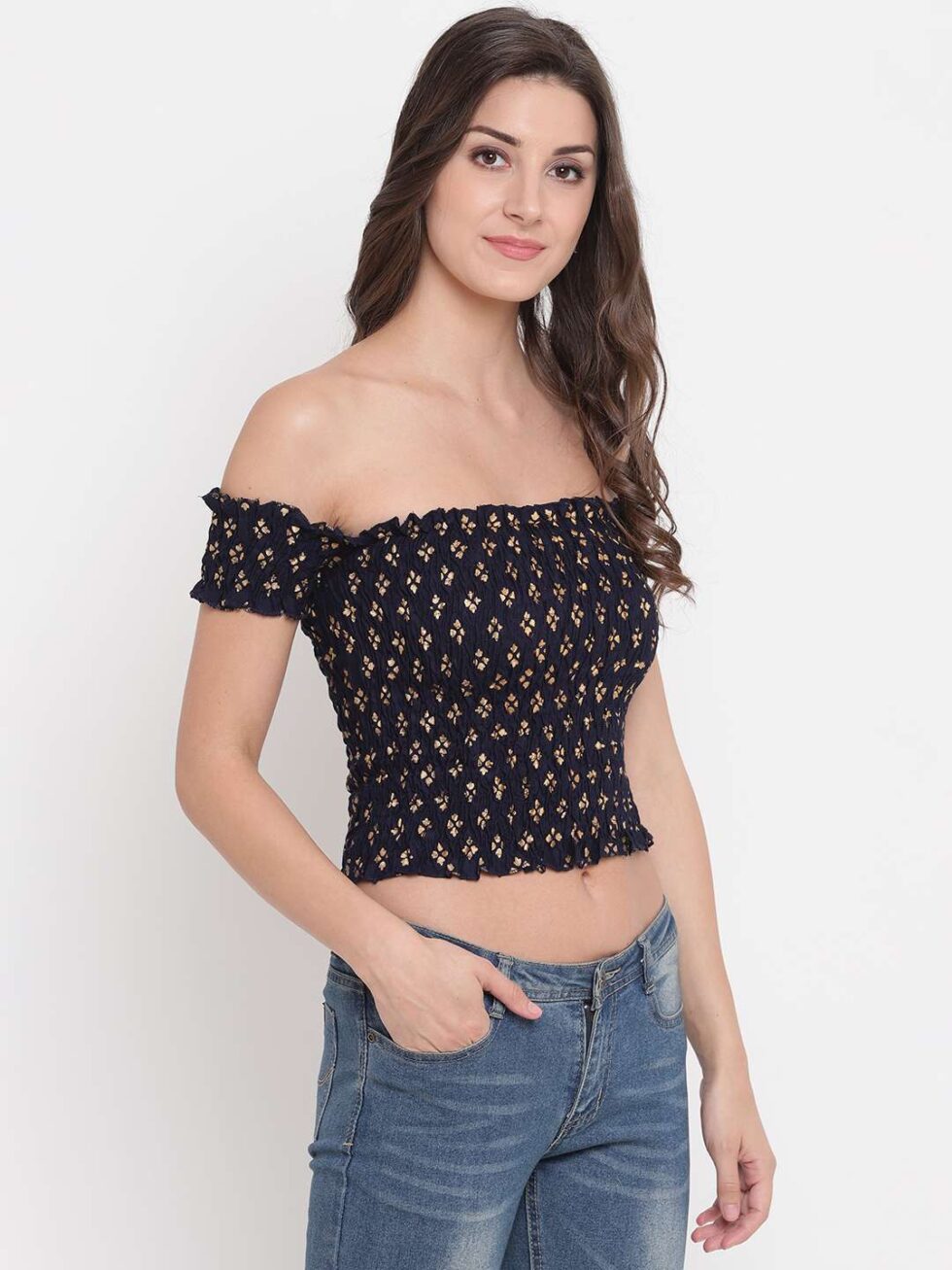 Turn heads with this chic off-shoulder smocked crop top. Featuring a flattering shirred fit, ruffled trim, and vibrant color, it?s perfect for pairing with high-waisted jeans, skirts, or shorts?ideal for both casual outings and dressy occasions.