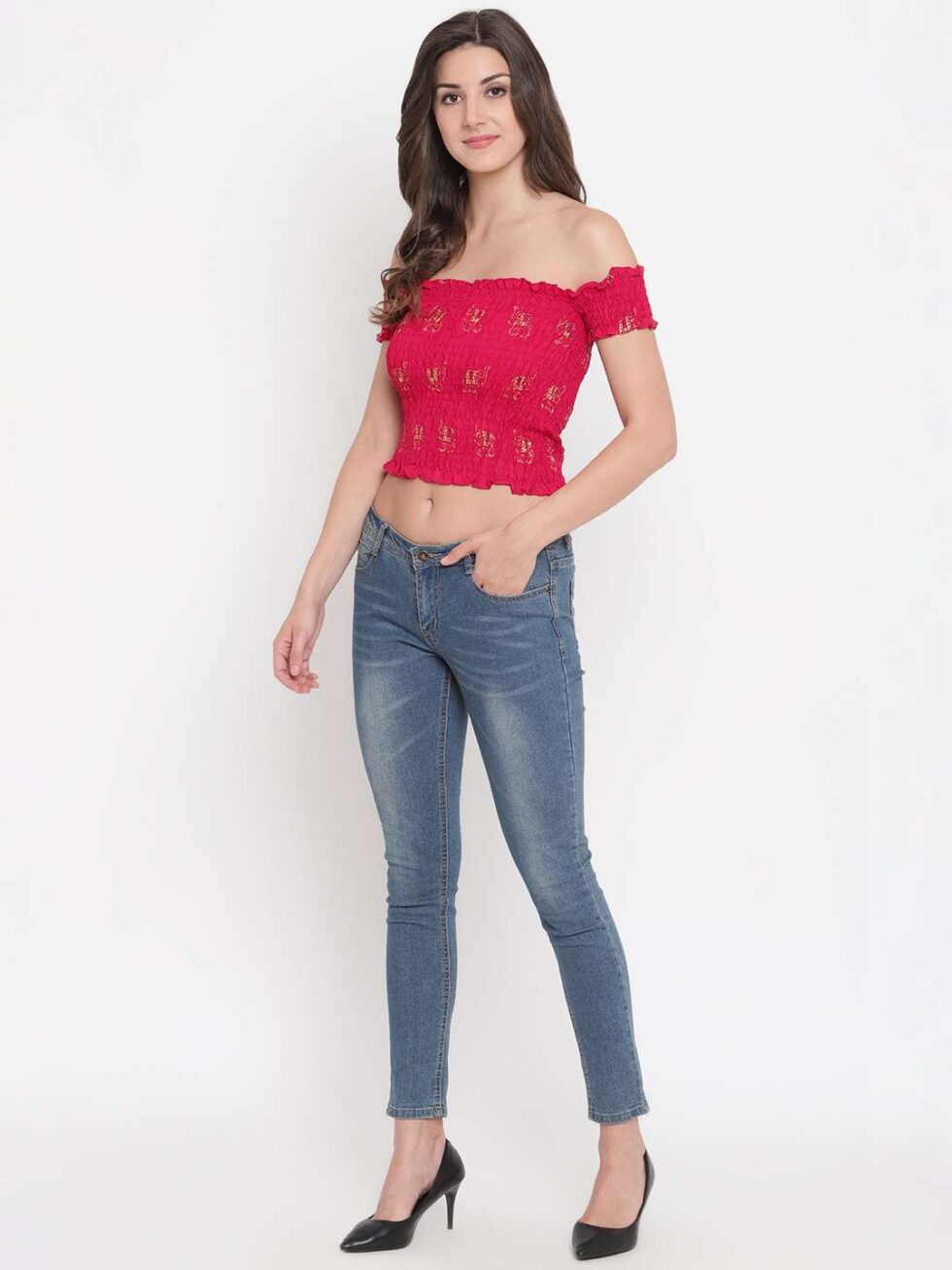 Turn heads with this chic off-shoulder smocked crop top. Featuring a flattering shirred fit, ruffled trim, and vibrant color, it?s perfect for pairing with high-waisted jeans, skirts, or shorts?ideal for both casual outings and dressy occasions.