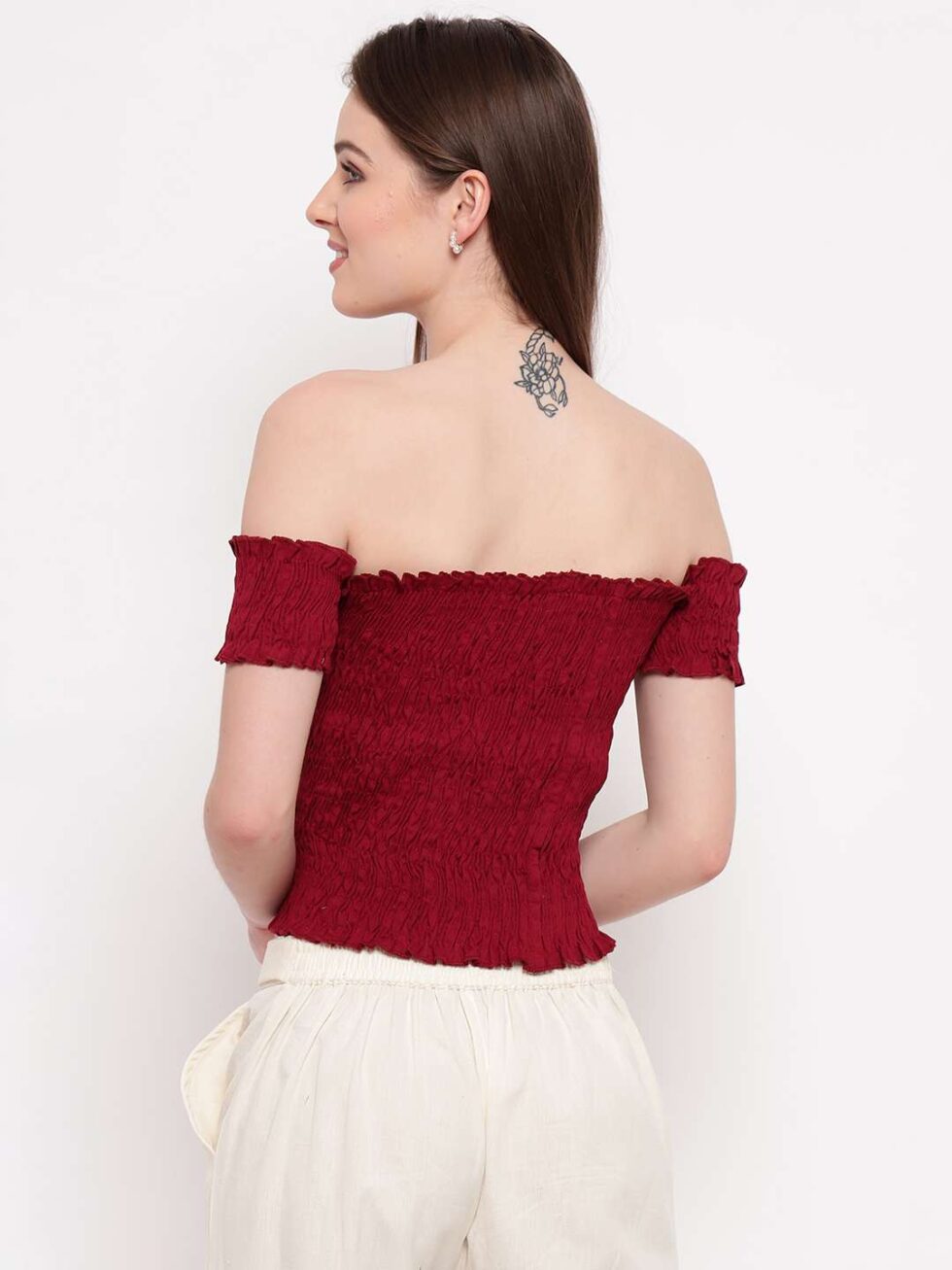 Turn heads with this chic off-shoulder smocked crop top. Featuring a flattering shirred fit, ruffled trim, and vibrant color, it?s perfect for pairing with high-waisted jeans, skirts, or shorts?ideal for both casual outings and dressy occasions.